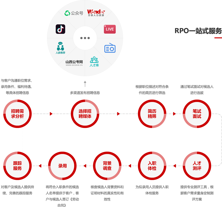 招聘流程外包服務(wù)(RPO)是一種以客戶為導(dǎo)向,以項目為建制,解決招聘任務(wù)的服務(wù)方案。RPO可以滿足企業(yè)節(jié)約招聘成本、優(yōu)化招聘流程、緩解招聘壓力,保證高質(zhì)量的招聘結(jié)果。